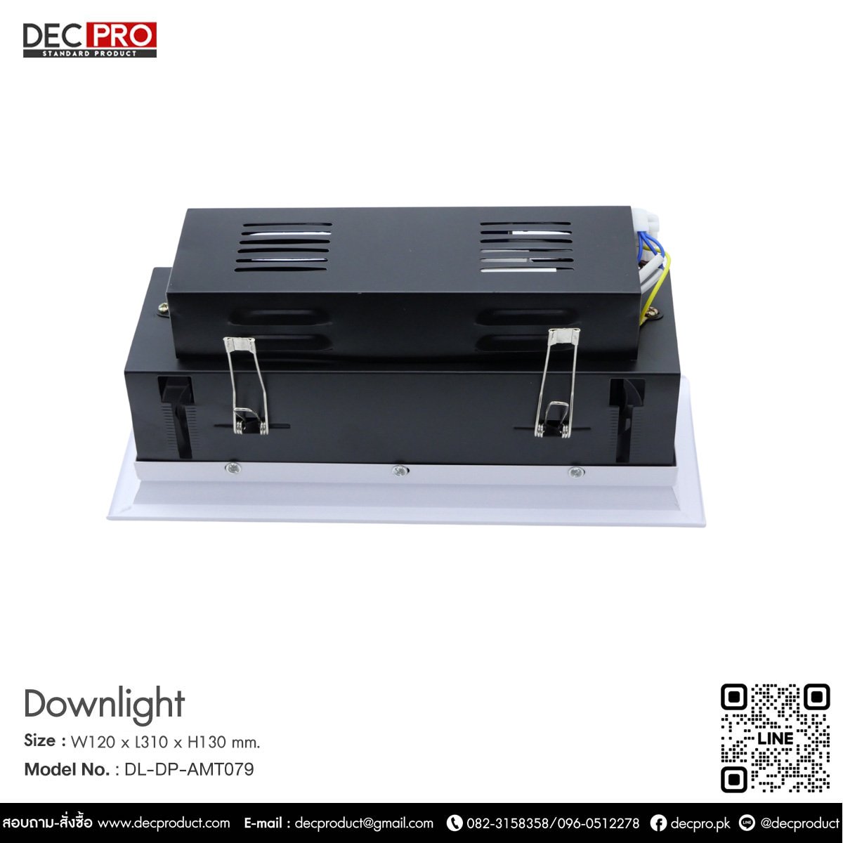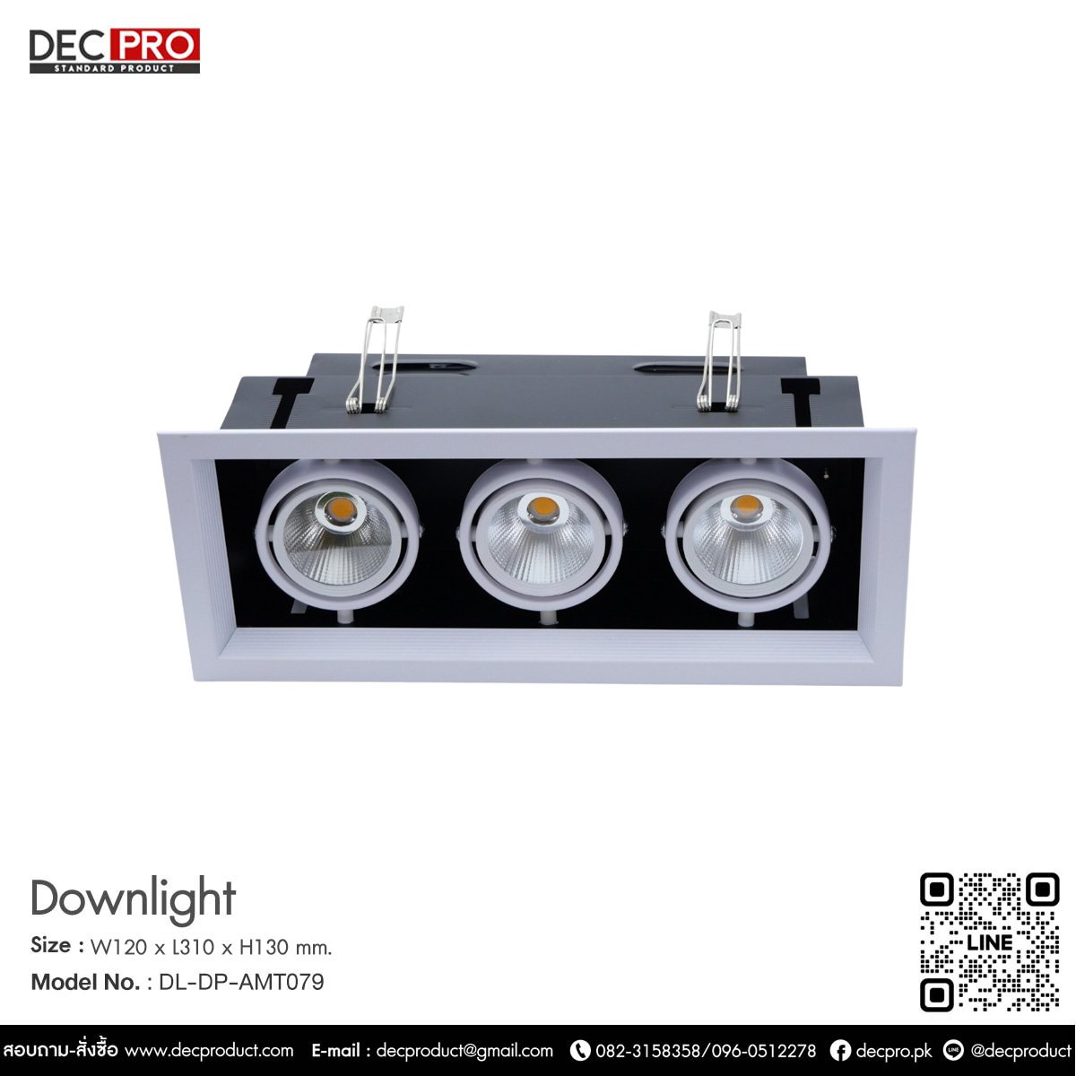 โคมไฟดาวไลท์หน้าเหลี่ยม สามหลอด E27 Size : W120 x L310 x H130 mm Color : WHITE-WH, WHITE-WW Cut Out : Ø 275 x 100 mm. Material : อะลูมิเนียม + เหล็ก (ALUMINIUM + STEEL) Light Bulb: LED 15W
