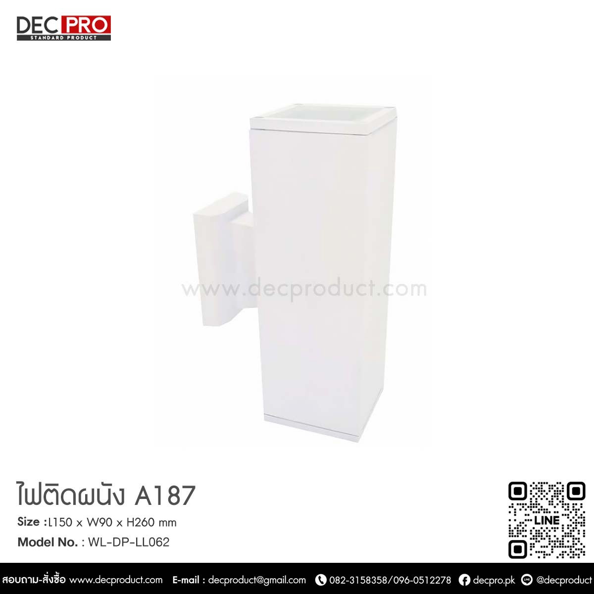 Dimension : L150 x W90 x H260 mm Lamp Type : E 27 x2 Pcs. LED Bulb 8W (Max) Material : Powder Coated Aluminum, Glass Color : White Weight : 1.1 KG. IP : 65