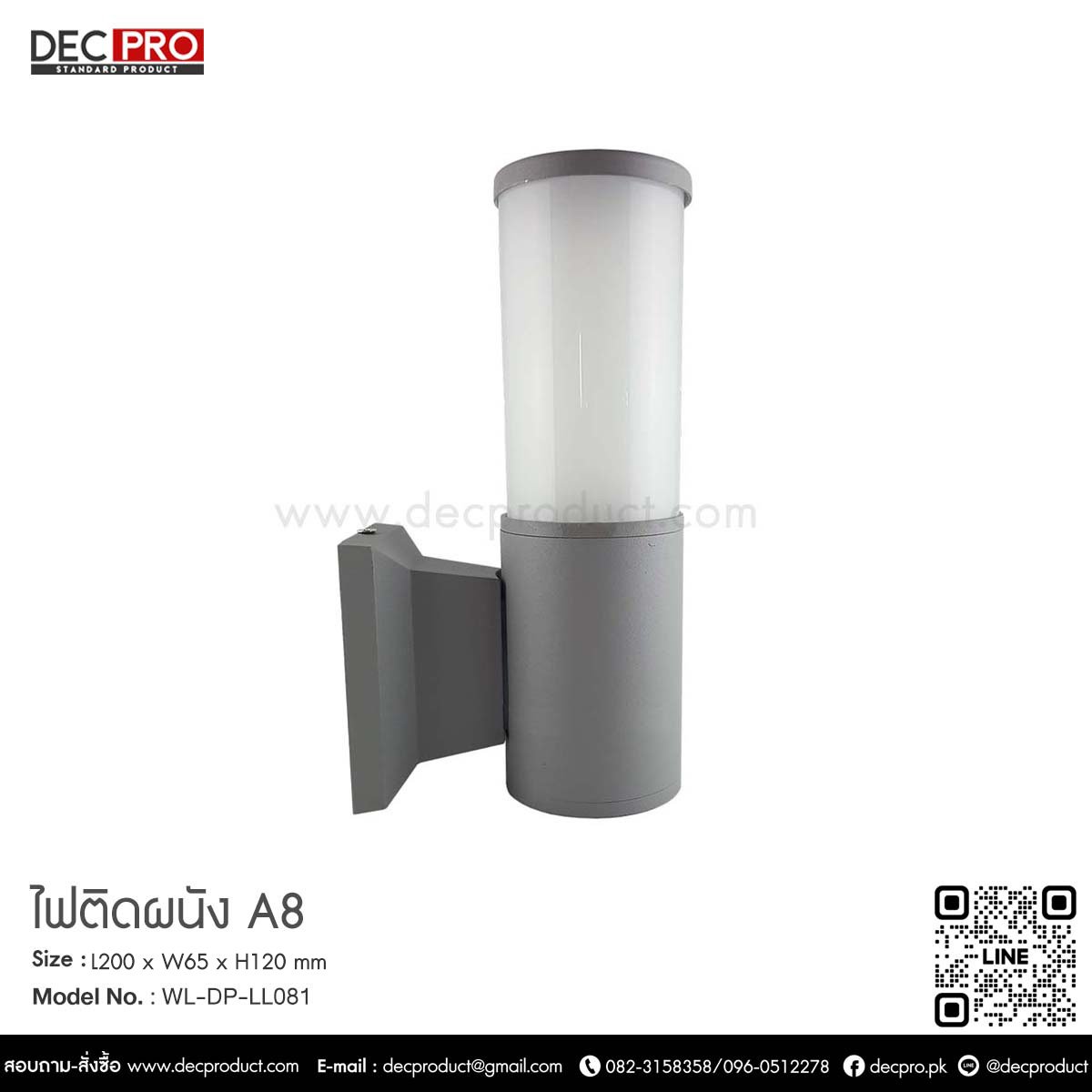 Dimension : L200 x W65 x H120 mm Color : Grey, Frosted Lamp Type : E27 x 1pc (LED Bulb G45 Max) Material : Powder Coated Aluminum, Polycarbonate Weight : 0.2 KG. IP : 65